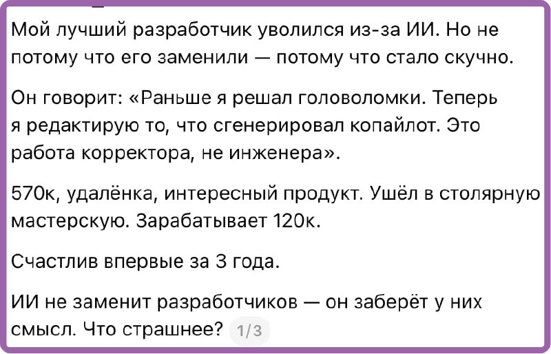 ИИ реально помогает. Недавно случай - сидел с 2 монстрами разработки (на двоих 40 лет в программировании, не шучу) и обсуждали, как в html определить что страница товара (помимо opengraph и т.п.). Ребята лениво спорили, а я думаю - дай спрошу Gemini 3.0 Pro... Короче, она написала еще +20 неочевидных способов детекции, подготовила сразу код на c# для обнаружения, расставила веса для минимизации ошибочных выводов и т.п. Наши мастодонты посмотрели и сказали - нихуасебе :) и купили подписки. Это не шутка, так и было. Русский ИТ бизнес