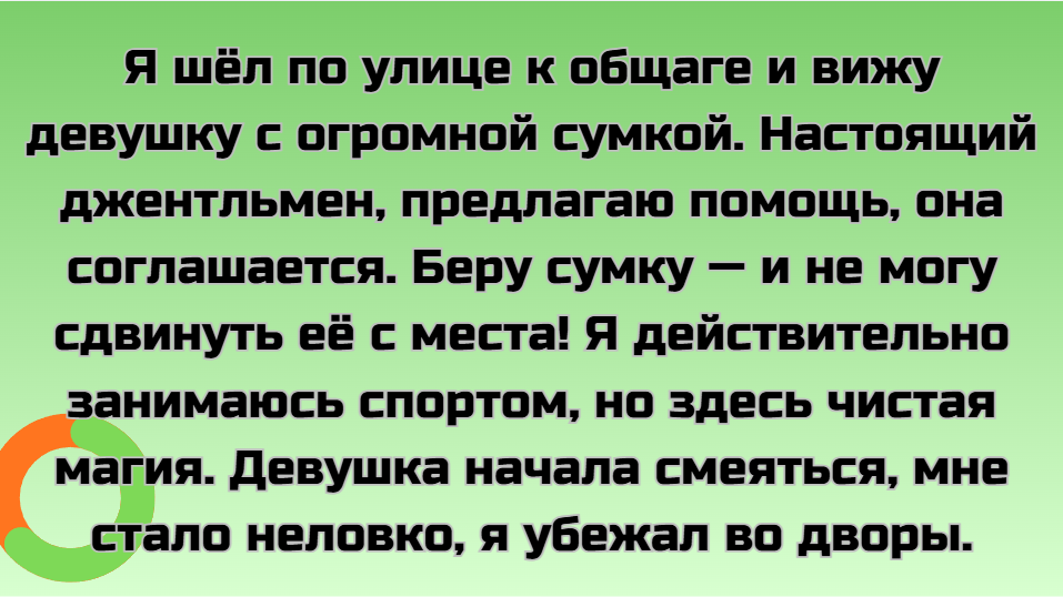 - Я шёл по улице к общаге и вижу девушку с огромной сумкой. Настоящий джентльмен, предлагаю помощь, она соглашается. Беру сумку — и не могу сдвинуть её с места! Я действительно занимаюсь спортом, но здесь чистая магия. Девушка начала смеяться, мне стало неловко, я убежал во дворы.