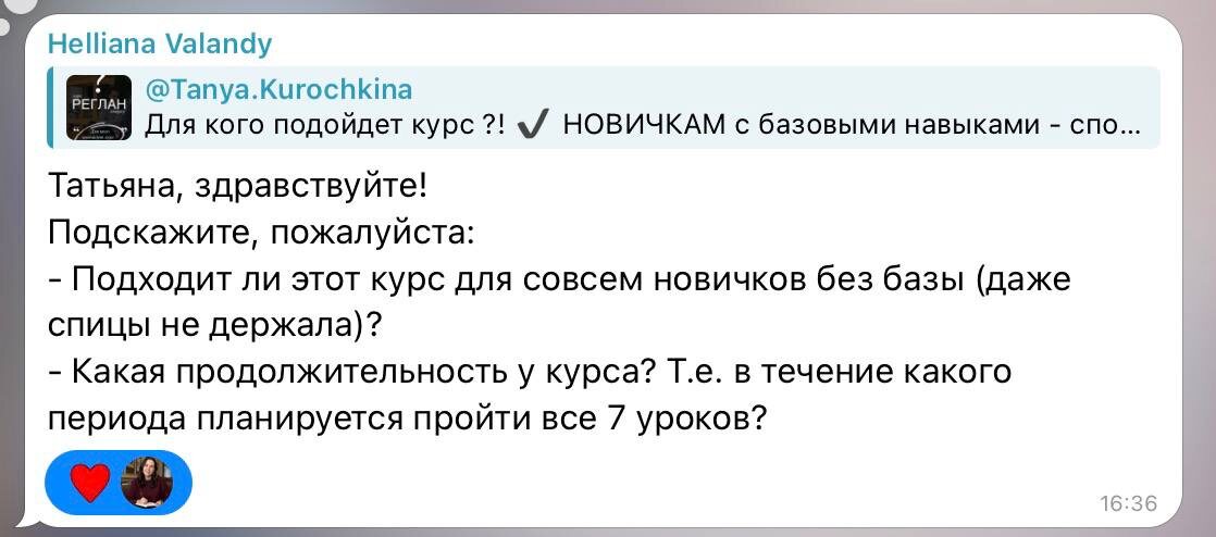 сообщу когда и во сколько он пройдет ! А пока - я готова отвечать на все ваши вопросы ! Поэтому пишите ! Не стесняйтесь ! 1. Новичка со всем без базы тоже можно ! В этом потоке я планирую добавить полноценные видео , где на образцах можно будет отработать набор петель и закрытие, лицевые и изнаночные ! А далее я просто новичкам рекомендую купить моточек бюджетной пряжи, чтобы отработать сам реглан и кокетку ! Чтобы вязать и распускать, до тех пор, пока не получится отлично , чтобы перейти уже к работе над изделием ) 2. Продолжительность курса не ограничена ! Но продуктивная работа плотная в рамках группы предполагается на 6 недель ! Далее чат работает в режиме обратной связи ) Проходить уроки , вязать и задавать вопросы можно в своем темпе )) Все возникающие вопросы - пишите в комментариях ! И я отвечу вам на них )) https://tanyakurochkina.ru/wpm-category/kurs-reglan-baza/