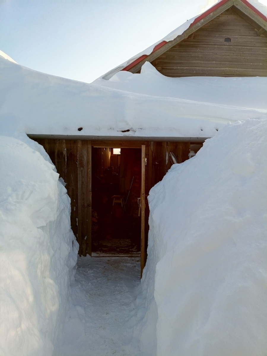 Помните заваленную дверь? Так вот, высунуть человека в щель, как планировалось, не удалось. Мои надежды рухнули, несмотря на то, что человек специально был не кормлен с утра, чтобы быть протиснутым в щель. Проталкивал черенком лопаты, чуть черенок не сломал. Пришлось его перебрасывать через забор с лопатой наперевес и ждать, пока он проберется вокруг дома по сугробам по пояс. Только благодаря