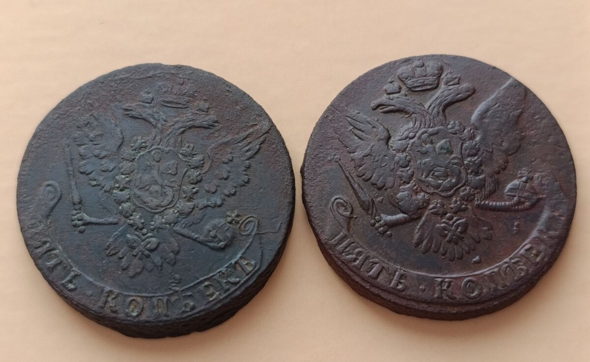 Медные пятаки Елизаветы Петровны ценятся в нумизматических кругах. В первую очередь это связано с тем, что монеты выпускались совсем непродолжительное время - с 1758 по 1762 годы из расчета 16 рублей монетами из пуда меди. Если собирать коллекцию-погодовку медных монет, то в ней должно быть 9 монет номиналом 5 копеек. В каталогах еще указываются монеты 1757 года, но их существованием можно пренебречь. Часть монет имеет буквы монетного двора вида ММ - Красный монетный двор. Другая более массовая часть монет букв монетного двора не имеет. Их чеканили на нескольких монетных дворах. У меня в закромах есть лишь два медных пятака (я их уже однажды показывал): Как видно, под лапами орла нет обозначения двора. К сожалению, реверс у пятака 1760 года оставляет желать лучшего. Но желать можно чего угодно, если на то есть смысл. К примеру, в наших краях вряд ли можно вообще встретить монеты с буквами ММ. А если собрать хотя бы без букв, то еще нужно 1762 (редкий), 1761 и 1758. И что характерн