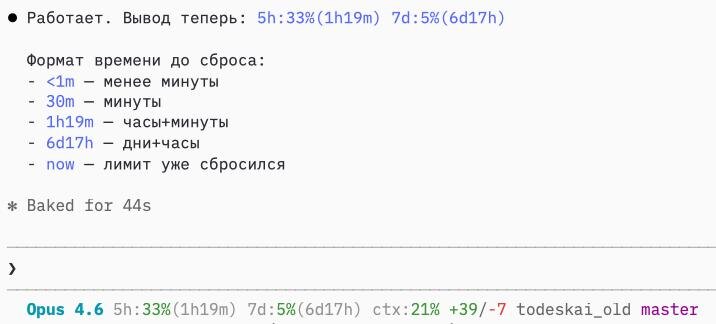 еще доработки статус бара внутри claude code теперь пишет еще и время - через которое сбросится лимит (по подпискам) готовый файлик в комментарии прицеплю к сообщению, там же и описание куда его положить https://dzen.ru/media/chernovdev/esce-dorabotki-status-bara-vnutri-claude-code-6994bae853172118b0f084f2 https://dzen.ru/id/5e71ba730bce7c30bde68f29