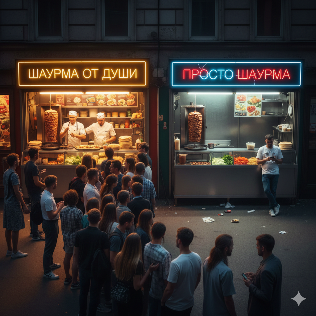 Вы выходите на улицу и видите классическую городскую загадку. Два ларька стоят бок о бок. В обоих одинаковое мясо, одинаковая цена. Но у одного — толпа людей, а у другого повар листает ленту в телефоне, а прилавок почти пуст. Почему так происходит?