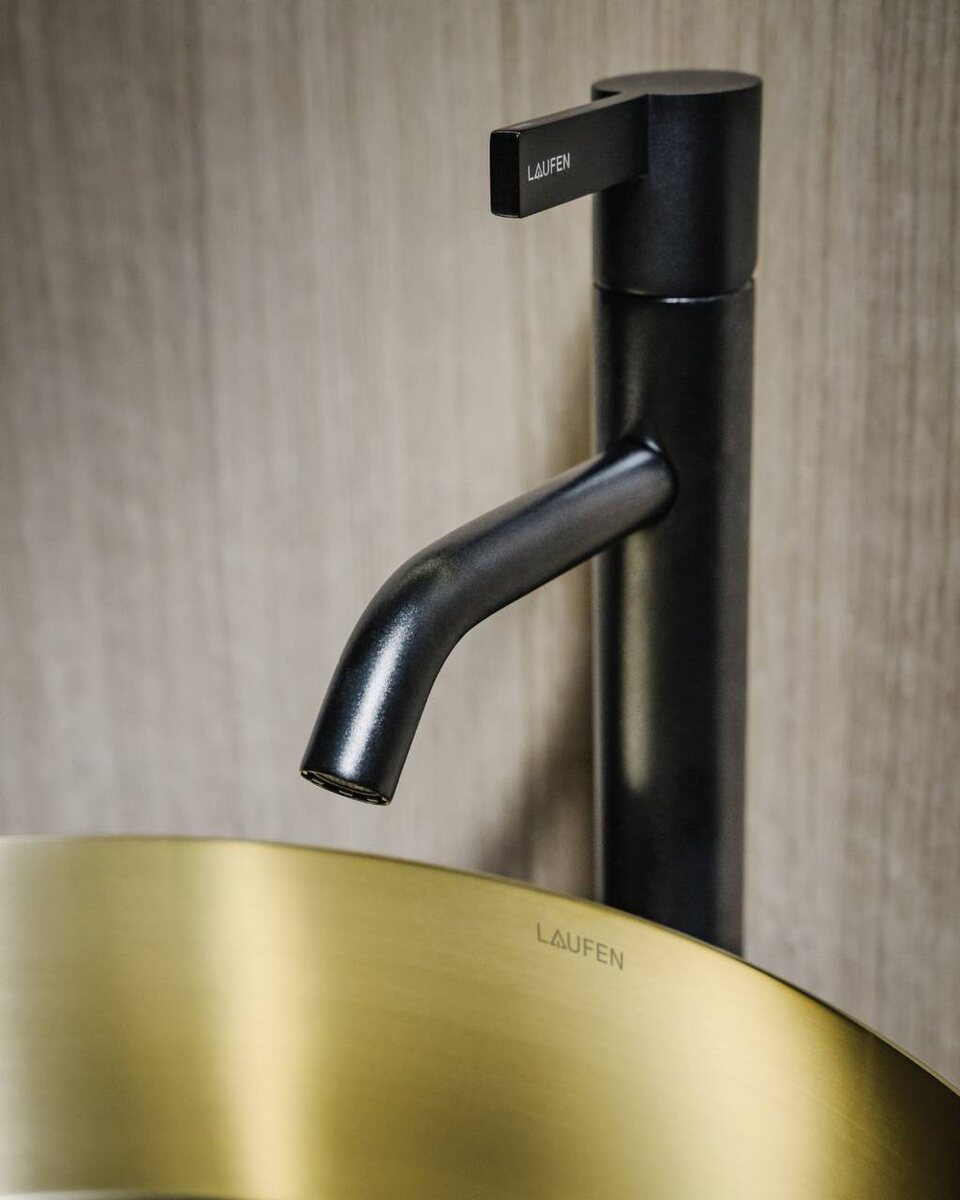 Матовая латунь раковины Rivo сочетается с матовым черным цветом смесителя Kartell.