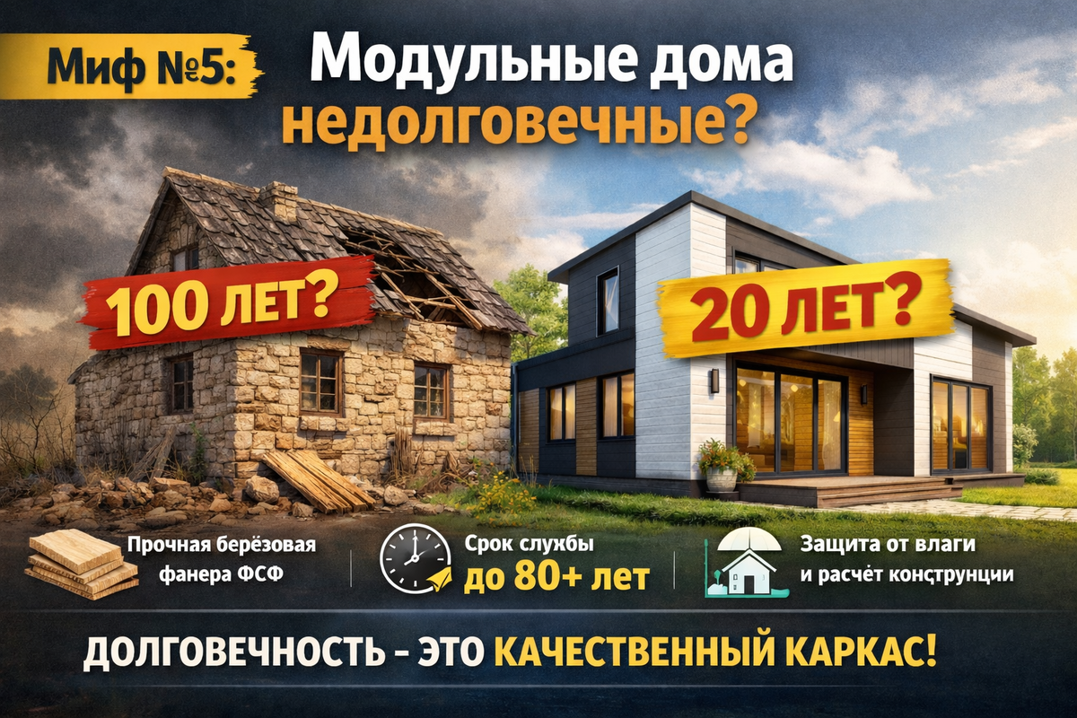 Дом не живёт «сто лет» только потому, что он кирпичный. Срок службы определяется узлами, влагозащитой и качеством производства. Каркас на влагостойкой ФСФ фанере при правильной сборке служит десятилетиями – и нередко стабильнее обычной доски.