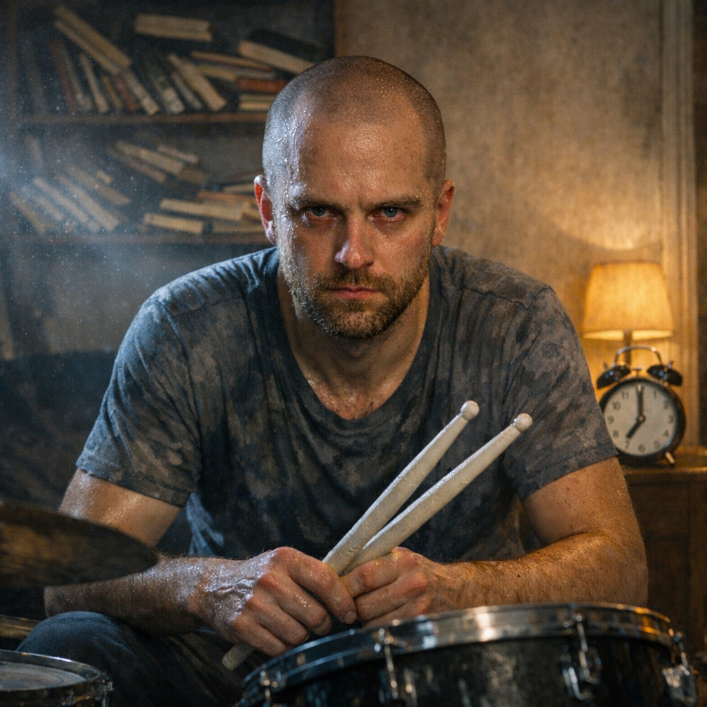 Через пять минут я разогрелся. Перешёл на заполнения — шестнадцатые по хай-хэту, синкопы по томам, крэш на сильную долю. Громко. Очень громко. Барабанная установка в квартире — это не гитара за стеной. Это землетрясение. Каждый удар — через пол, через стены, через потолок.