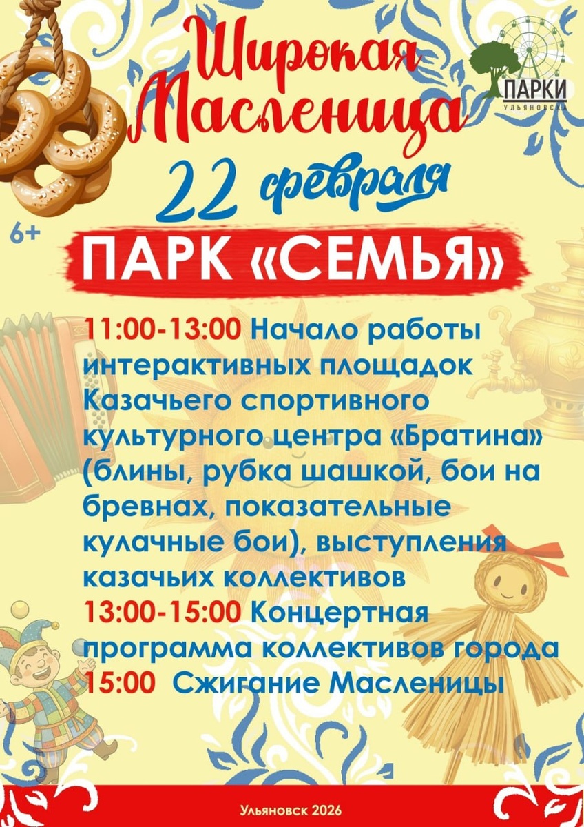 22 февраля с 11:00 до 15:00 жители города могут принять участие в праздновании Масленицы. В парке будут работать интерактивные площадки Казачьего спортивного культурного центра «Братина, выступят творческие коллективы города, а в завершении состоится традиционное сжигание чучела Масленицы. Фото: Парки Ульяновска Оперативные новости в МАХ