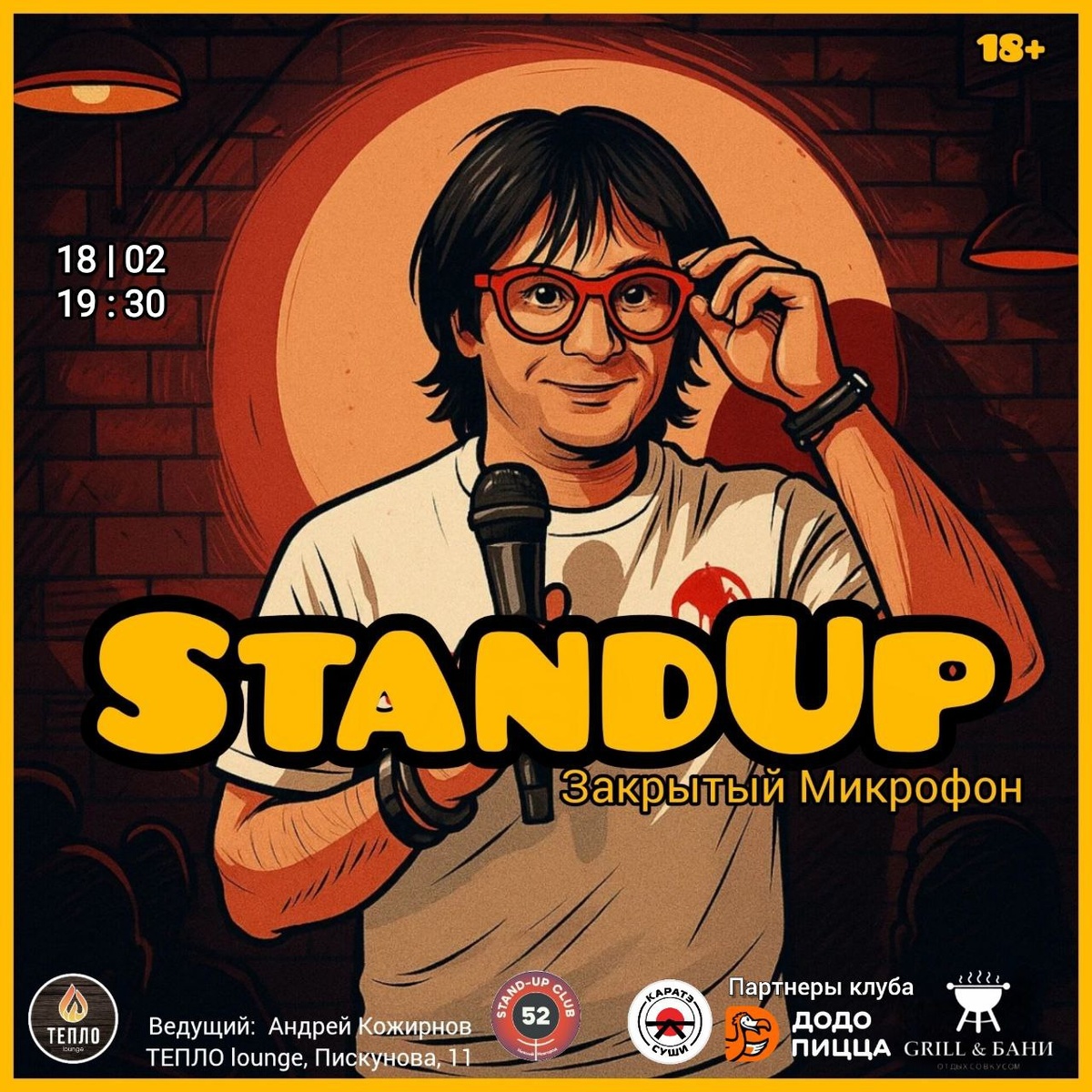 Закрытый Микрофон 👉 18 февраля (ср), 19:30 👉 ТЕПЛО lounge, Пискунова, 11 Вход: 350руб (18+) 👉 Выступают опытные комики со стендапом. Это вечер юмора и хорошего настроения! Что может быть лучше?! Приходи, кайфуй и смейся! Бронь через сообщения группы бара: https://vk.com/im?media=&sel=-214726626 или по тел: +79308192101 ❗Среди зрителей разыграем сертификат на большую пиццу! Подробно в группе организатора в ВК. 👉 Мы делаем комедию, соц сети и мессенджеры: https://taplink.cc/standupclub52, подписывайся.