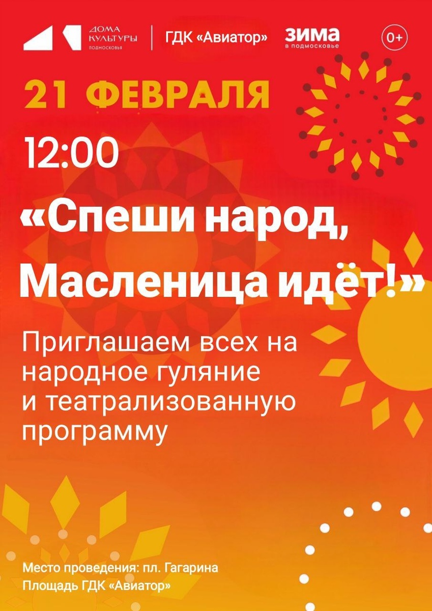 ✨ 🔥 СПЕШИ НАРОД, МАСЛЕНИЦА ИДЁТ! 🔥 Одевайтесь потеплее, берите родных, друзей и отличное настроение! Будем веселиться от души! 🥞 В программе: ✅ Шумные игры и конкурсы ✅ Задорные хороводы ✅ Весёлые забавы для детей и взрослых До встречи на гулянье!🤗 🚫 Возраст: 0+ 📆 21.02.2026🕒12:00 🏢 Городской дом культуры «Авиатор» 📍 г. Домодедово, ул.Гагарина, д.1 ✅ Мероприятия Домодедово https://dzen.ru/id/66f10385cc4c5a16f7b5fb02 http://vk.com/domodedovo_events http://dzen.ru/domodedovo_events
