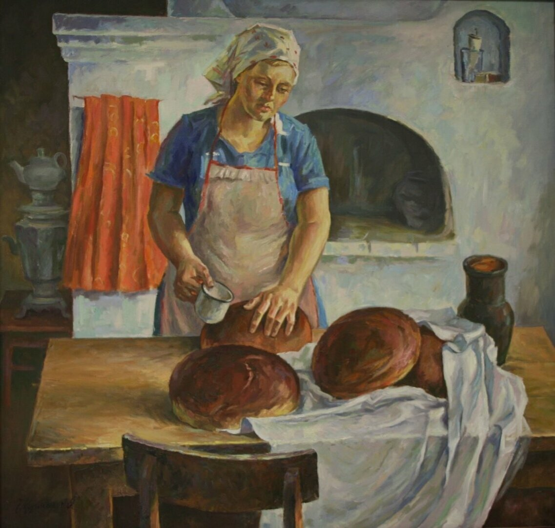 Еще ей прясть и ткать, еще ей хлебы печь, щи - кашу варить, детей, мужа обстирывать. По уму, по распорядительности недаром хозяйку величали в северных деревнях «большухой».
