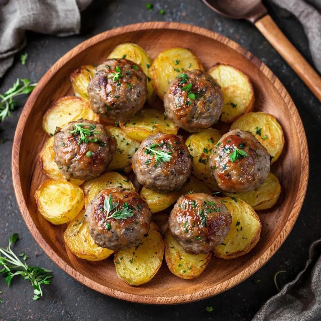 ! Добрый вечер, друзья 🤝 Сегодня у нас на повестке дня простое, но невероятно вкусное блюдо – картофель с фрикадельками. Если вы хотите приготовить что-то сытное и аппетитное без особых усилий и затрат времени, то этот рецепт именно для вас! 😉 Ингредиенты: - Картофель – 500 г - Фарш (свинина+говядина) – 300–400 г - Яйцо куриное – 1 шт. - Панировочные сухари или хлебные крошки – 2–3 ст. л. - Соль, перец – по вкусу - Зелень (укроп, петрушка) – свежая или сушëная - Растительное масло – для жарки. Приготовление: *1.** Приготовьте фарш для фрикаделек. Смешайте свино-говяжий фарш с яйцом, добавьте сухари или хлебные крошки, посолите и поперчите. Хорошо перемешайте руками до однородности массы. 2. Сформируйте небольшие шарики из фарша размером примерно с грецкий орех. 3. Почистите картофель и порежьте его кружочками толщиной около 7 мм. 4. Разогрейте сковородку с небольшим количеством растительного масла. Выложите картофель так, чтобы он покрывал дно посуды равном