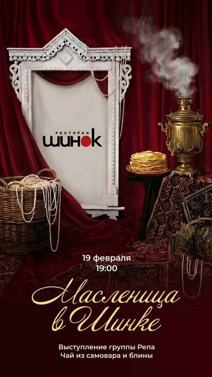 19 февраля в ресторане «Шинок» широко и весело отмечают Масленицу — один из самых душевных праздников в году. С 19:00 гостей ждут: румяные блины с вареньем и ароматный чай из настоящего самовара. А в 20:00 начинается концерт группы «Репа», которая сыграет современную народную музыку: участники коллектива смело экспериментируют с любым музыкальным материалом, привнося в него неповторимый народный колорит. Всю масленичную неделю в ресторане действует специальное блинное меню: — Блины четырех видов: ажурный, кукурузный, гречаный и фирменный блин «Шинок» — любой за 210₽ — Кондименты от шеф-повара Елены Никифоровой: сельдь с красным луком (750₽), семга (890₽), муксун — Икорная коллекция: щучья, красная, черная икра — Сладкие начинки: варенье и сметана Для больших компаний в меню домашние блюда из блинов и блинные сеты (от 13 900₽). При заказе блинного плато — 0,5 водки «Белуга Noble» в подарок. Прекрасная возможность ярко отпраздновать масленицу в ресторане «Шинок» ! 🥞