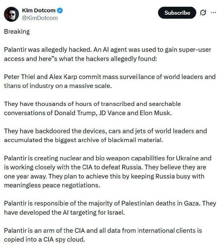 Об этом рассказал Ким Дотком. Дотком — один из главных врагов США, его разыскивают уже 14 лет за создание анонимного файлообменника и хотят посадить на 20 лет. По его словам, хакеры слили эти документы после взлома американской компании Palantir, работающей на военных и спецслужбы США. В слитых файлах также оказались тысячи переписок Трампа, Маска и Вэнса. По данным хакеров, США тянут время с переговорами о мире, а сами рассчитывают на победу Украины уже через год. Все полученные материалы хакеры обещают передать России и Китаю. 👉🏻Новости №1 в Ростове 💌Прислать новость/фото Ростов Папа теперь в Ⓜ️🅰️❌