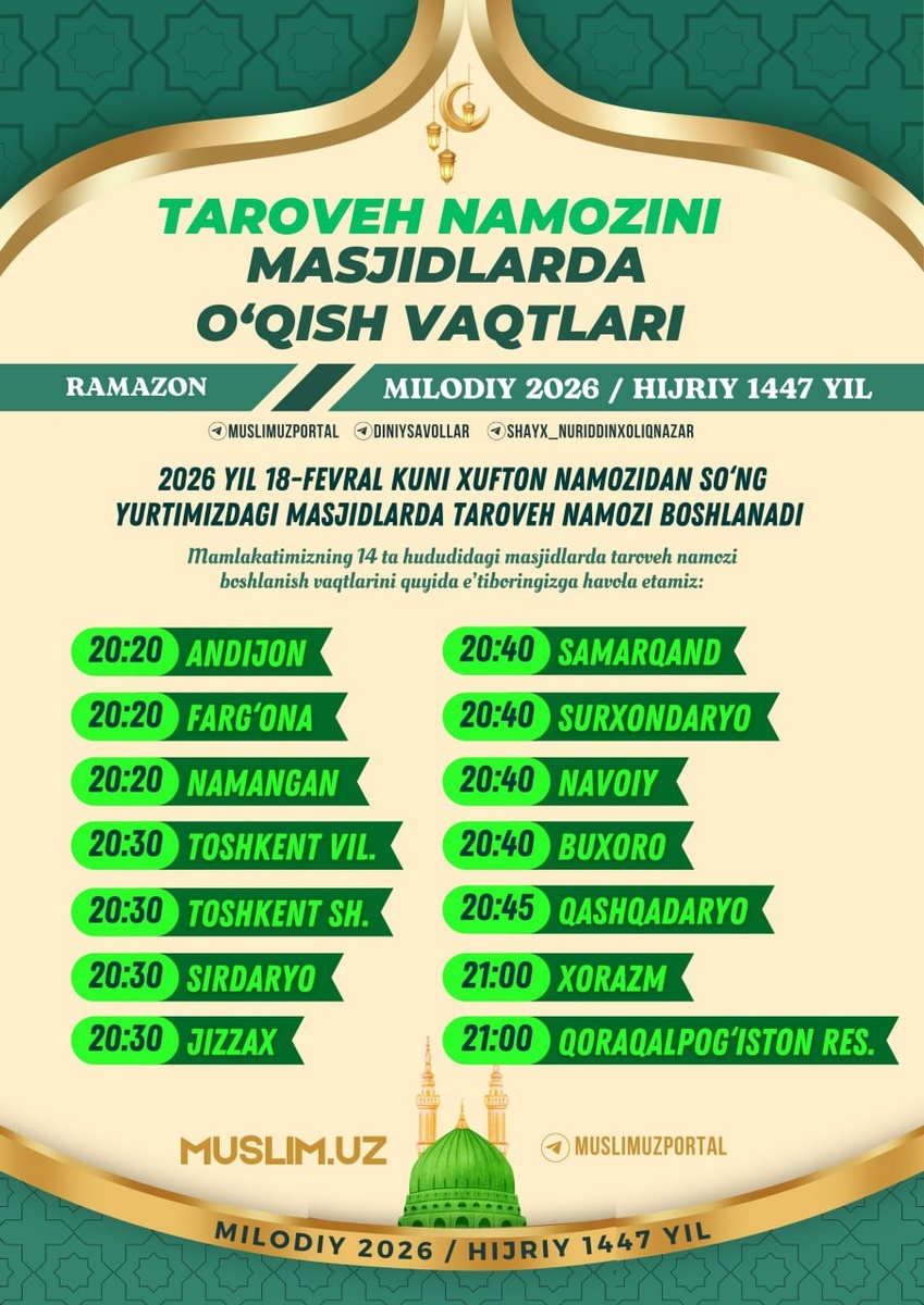 18-fevral, chorshanba kuni xufton namozidan so‘ng masjidlarda tarovih boshlanadi.