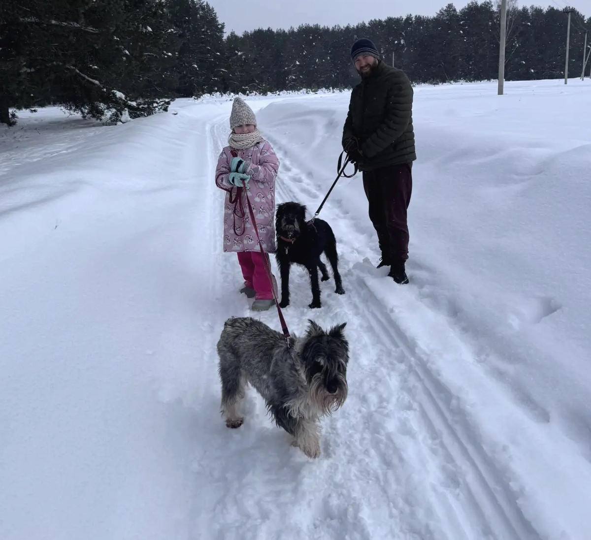 В прошлые выходные в гости к Ирине в Тверскую область заехали хорошие люди и поучаствовали в новом нашем проекте "прогулки и шнауцеры". А почему бы и нет, собак у Ирины на передержке много, всем хочется внимания, многим ещё и выгула, опять же общение с новыми людьми им на пользу, а люди впечатлениями получают от новых собак, отзывы, фотографии - всё всем в дело! А вот рассказ от навестившей со всей семьёй, включая своего миттеля Бруню, Марии и её впечатления от общения с собаками: Про метиса Эльзу: "Эльза с Джессикой были нам выданы первыми. Счастью Эльзы не было предела, первые 500 метров шла, радостно подпрыгивая, затем успокоилась и всю дорогу гуляла, гордо возглавляя колонну. Мужа, который вёл её на поводке, тут же заобожала и влюбила в себя, вечером он признался, что никак не может выкинуть её из головы. Наша Бруня пыталась с ней поиграть, но Эльзе значительно важнее был контакт с человеком. Поводок не тянет, если и заинтересуется каким то запахом, то ненадолго, постоянно проверяе