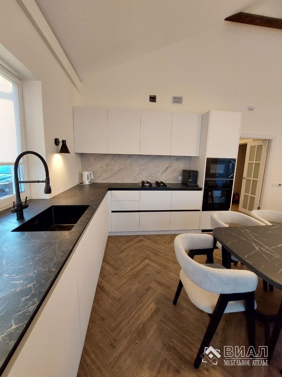 Материалы становятся главными героями интерьера: - тонкая и прочная столешница (компакт HPL "Мрамор галактик") темного глубокого цвета, как зимний Байкал в ночное время - тактильность ощущается в матовых фасадах "Белый жемчужный" и ЛДСП белого цвета с гладкой шелковистой текстурой Ощущение порядка придают закрытые шкафы и невидимые ручки-профиль Пеналы со встроенной техникой создают монолитность Качественная фурнитура обеспечивает плавное и бесшумное использование ящиков и дверей ______ Мебельное ателье "ВИАЛ" Изготовление мебели От замера до установки г. Рыбинск ул. 50 лет ВЛКСМ, 42 Тел. 55-96-06, 22-88-30 8-902-222-96-06 Пн-пт с 10.00 до 18.30 Сб с 10.00 до 14.00 Вс выходной