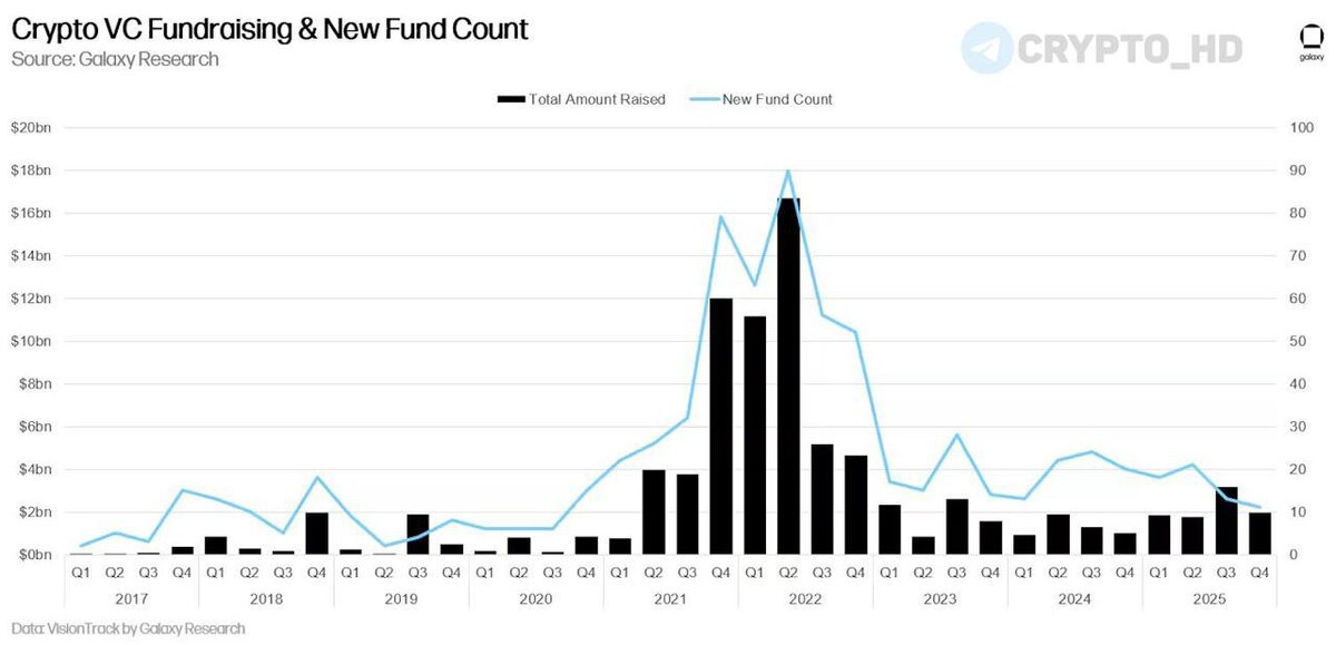 ➤ Почти 85% токенов сейчас торгуются ниже стартовой цены. Многие венчурные сделки едва выходят в ноль или уходят в глубокий минус. ➤ Наличие крупного венчурного фонда среди инвесторов больше не играет роли. ➤ Во втором квартале 2022 года криптостартапы привлекли почти $17b при появлении более 80 новых фондов. Инвесторы вкладывали деньги в любой проект, где в презентации было слово «крипто». ➤ С тех пор картина изменилась. Доходность фондов снижается каждый год. Новых фондов почти не появляется – антирекорд за 5 лет. ➤ Общий объем инвестиций за период с 2023-2025 гг. примерно равен сумме, привлеченных только за один 2022 год. Привычная схема «собрать раунд финансирования, запустить токен и сбросить его розничным инвесторам» уходит в прошлое. ➤ Но есть и хорошая сторона. Без больших фондов выживают только проекты с реальными пользователями и выручкой. Меньше скрытых продаж инсайдеров. Честные запуски. Команды, которые строят продукт – а не готовятся к следующему раунду финансировани