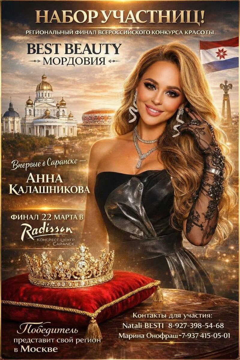 ! 🤩 Впервые в Саранске — специальный гость, ведущая и хедлайнер финала конкурса красоты BEST BEAUTY — Анна Калашникова ⭐️ 🔥 Стартовал набор на региональный финал BEST BEAUTY в Мордовии — официальный этап всероссийского фестиваля WORLD BEAUTY. 📍 Площадкой события станет один из крупнейших гостиничных комплексов страны Radisson и Конгресс Центр Саранск, который на один вечер превратится в территорию моды, красоты, камер и софитов. 👑 Победительница представит свой регион на Всероссийском финале в Москве. Участников ждёт вечер уровня большой столицы: ✨ welcome-пространство с интервью и съёмками ✨ гости из Москвы — артисты, продюсеры, дизайнеры ✨ концертная программа и fashion-показы ✨ коронация, награды, фуршет ✨ атмосфера настоящего глянца Твой шанс громко заявить о себе — сейчас. BEST BEAUTY Мордовия открывает двери будущим звёздам.