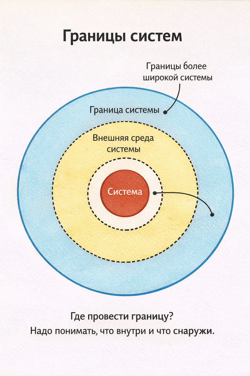 Граница системы — это невидимая линия, которая определяет, что мы считаем частью системы, а что — внешней средой.