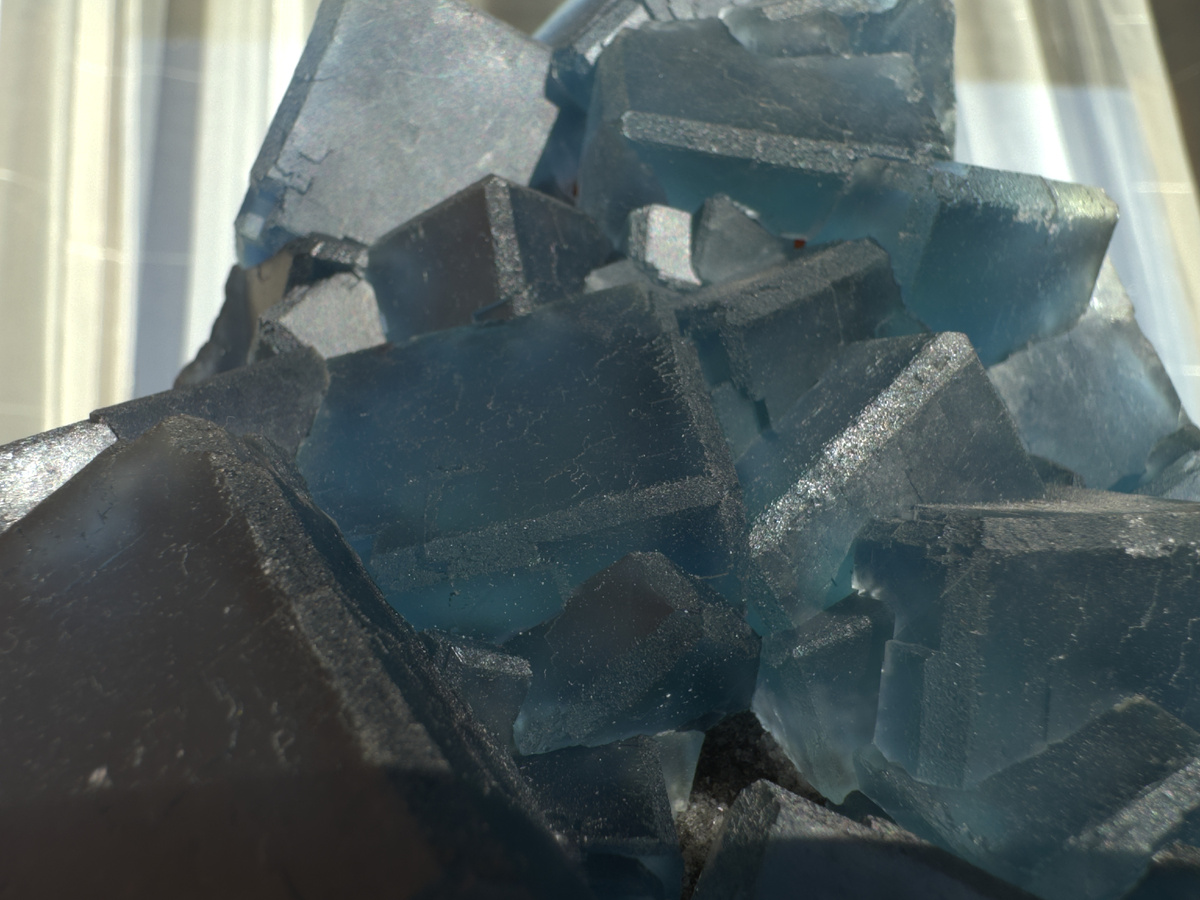 Композиция собрана плотным «букетом» из крупных кубических пластин. Цвет в кадрах читается как холодный сине-бирюзовый, местами уходит в более тёмную морскую глубину. На ряде граней заметна природная матовость — эффект «бархата», из-за которого плоскости выглядят не зеркальными, а мягкими. По кромкам и на отдельных площадках встречаются естественные линии/микротрещинки и следы контактов — то, что обычно сопровождает флюорит именно из-за спайности.