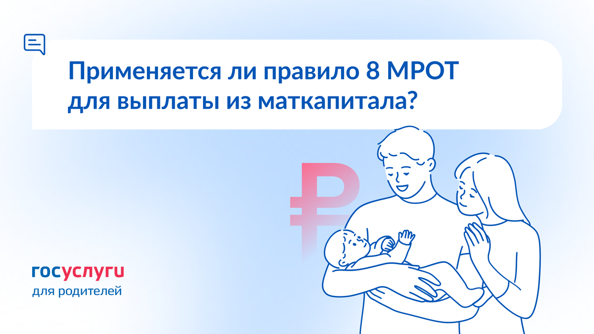 При назначении выплаты из маткапитала до 3 лет важен доход семьи — он должен быть не более 2 прожиточных минимумов на душу населения в регионе. Перечень имущества, правило нулевого дохода, 8 МРОТ и минимальные алименты без решения суда для этой выплаты не учитываются. Если члены семьи имеют доход менее 8 МРОТ, это не основание для отказа в выплате. Если нет решения суда и исполнительного производства о взыскании алиментов, они учитываются в размере, указанном в заявлении, без учета доли от МРОТ. Выплату из маткапитала можно получать одновременно с единым пособием на одного и того же ребенка. Полезное на Госуслугах 👉 Раздел о материнском капитале
