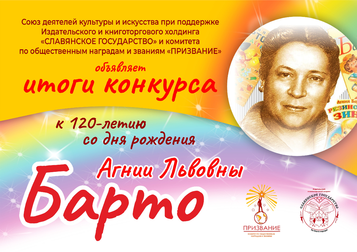 Дорогие друзья! Союз деятелей культуры и искусства при поддержке Издательского и книготоргового холдинга «СЛАВЯНСКОЕ ГОСУДАРСТВО» и комитета по общественным наградам и званиям «ПРИЗВАНИЕ» подвёл итоги поэтического конкурса к 120-летию со дня рождения Агнии Львовны Барто. Представляем победителя и призёров: Призёр (3 место) — Светлана Гаврилова (Сиверко)за произведение «Ожидание»; Призёр (2 место) — Ольга Кулясза произведение «Нотная тетрадь»; Победитель — Ирина Шульгиназа произведение «Разволшебные слова». Победитель награждается именным дипломом, сертификатом на бесплатное издание электронной книги в Издательском и книготорговом холдинге «СЛАВЯНСКОЕ ГОСУДАРСТВО» и реализацию изданной книги в интернет-магазине «Книжный Атласъ» с авторским отчислением с продаж. Участники, занявшие второе и третье призовые места, награждаются именными дипломами и сертификатами со скидками 30% и 15% на издание авторских книг в Издательском и книготорговом холдинге «СЛАВЯНСКОЕ ГОСУДАРСТВО». Внимание! Все