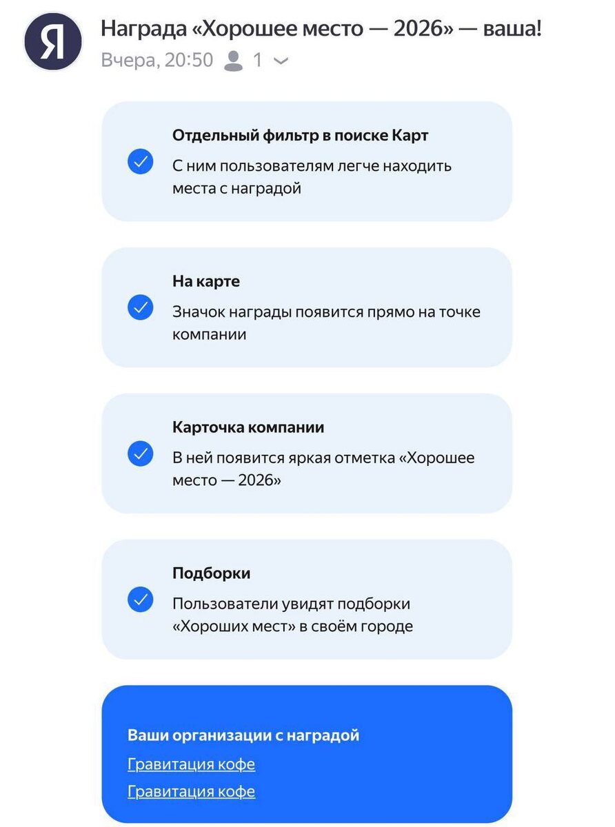 ещё по поводу награды «Хорошее место» от Яндекс Карт