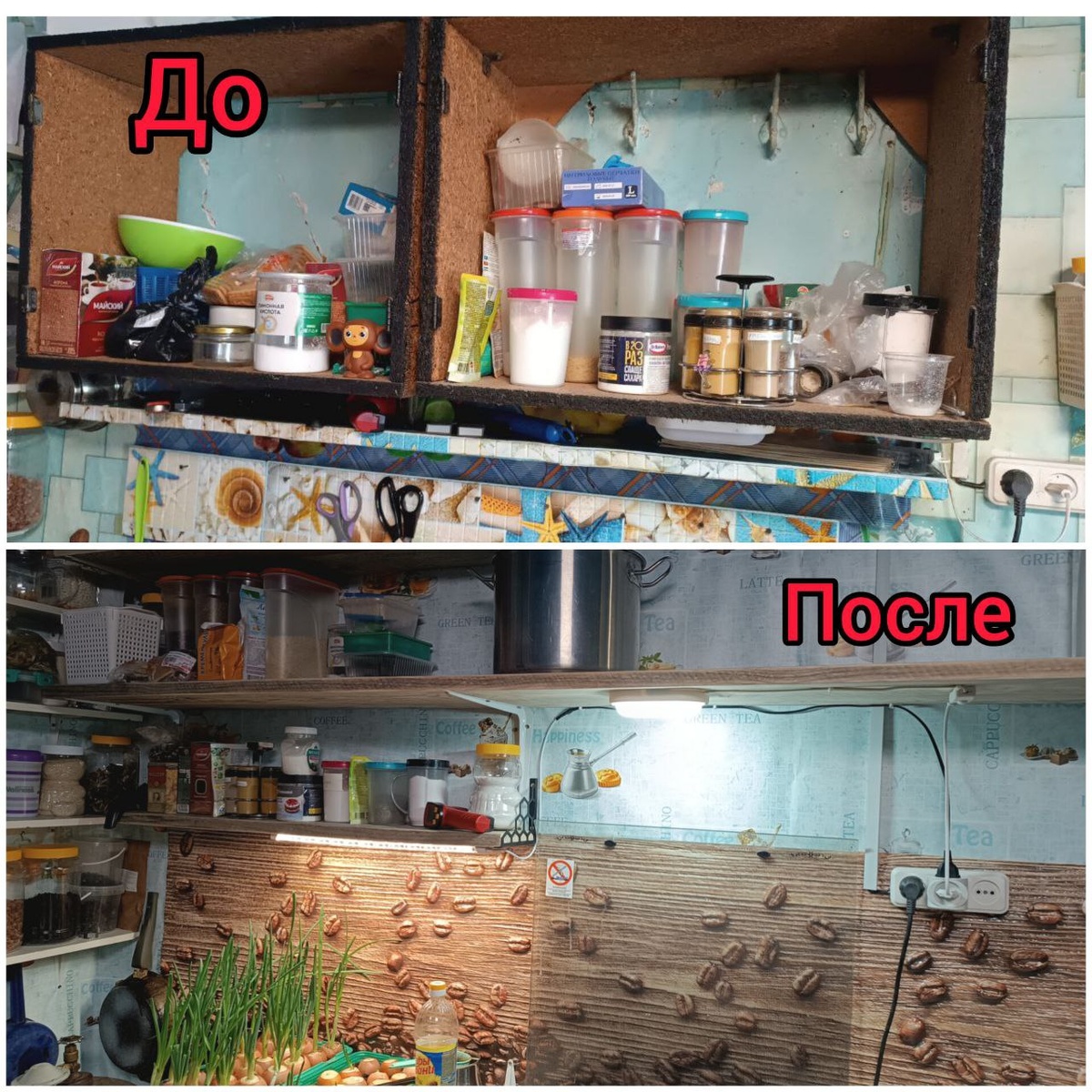 "😂 Надеюсь теперь понятно почему вообще не хочется публиковать что-то из нашей избушки🙈 "После" тоже не фонтан, но намного удобнее, светлее (по фото не видно, потому что у нас 10 вечера😄) и чище Цена вопроса: два рулона моищихся обоев, "пластиковый" фартук, кронштейны для полок, доска 25 мм До сих пор стою на своëм: облагораживать, как то серьёзно, избушку - нет смысла, нужно все средства💰 вкладывать в постройку нового дома🙂↕️
