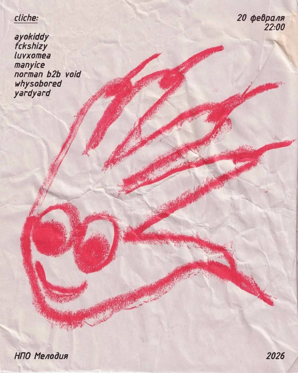 Пятница двадцатое на таком: Фкшизи, Лавксомея, Мэниайс, Вайсоборед, Айоукидди, Ярдиярд… и их друзья Норман и Воид. Теги такие: soundcloud, postemorap, emotrap, rage, cloudemo, hypertrap, trapmetal, dreamtrap, draincore, sigilkore, hexd, digicore, glitchcore. 🎫 Билеты 📆 20 февраля, в 20:00 📍 нпо Мелодия, Москва, 3-я ул. Ямского Поля, 2, корп. 5