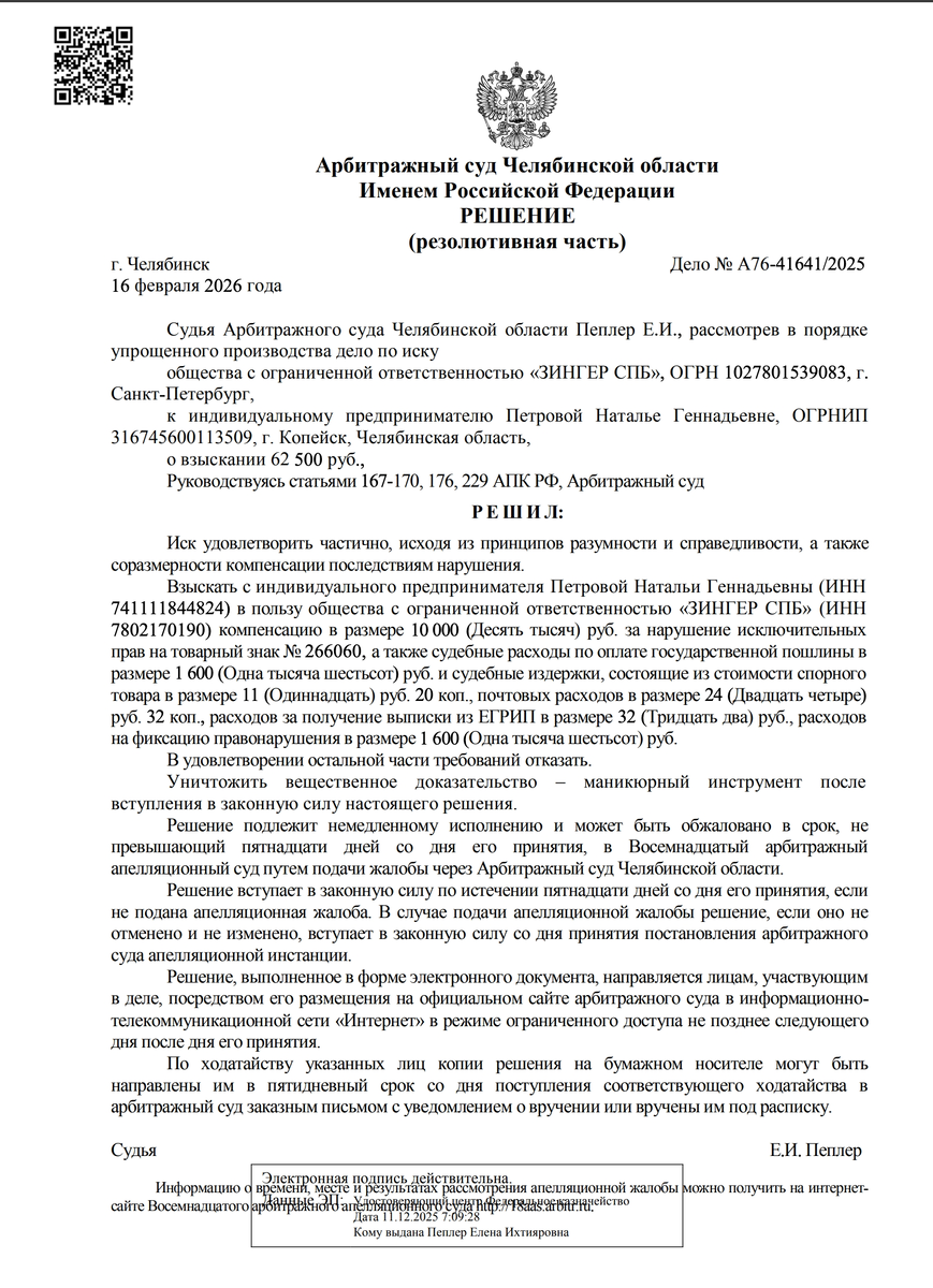 Ранее публиковала пост о правоприменительной практике по искам Зингер и Кайзер. Могу сообщить о том, что судьи всё чаще охотно применяют практику об установлении иной стоимости права, не связанной с ранними расчётами по цифрам лицензионных соглашений, а основанной на обстоятельствах фактического использования нарушителем товарного знака при реализации единицы малоценного товара. Так верными шагами идем на установление такой практики на всей РФ. Напомню, это не снижение компенсации, это установление иной стоимости права. При прошении о снижении может быть два варианта: либо суд не найдет оснований для снижения и удовлетворит по полной, либо снизит на 50% поскольку снижение в случае определения компенсации в двойной стоимости права возможно лишь на 50 % (по крайней мере по мнению многих судей). Ваш юрист Максимова Алина.