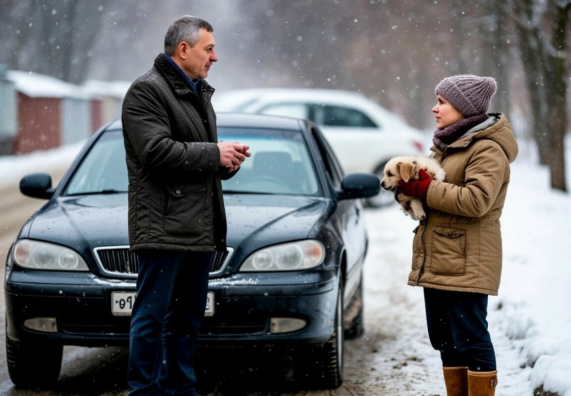 Алексей выбрался следом за шофером. Перед ними стояла бродяжка в потрёпанной куртке, прижимая к груди щенка. Геннадий кричал на неё, срываясь на визг, но Поляков остановил его жестом.