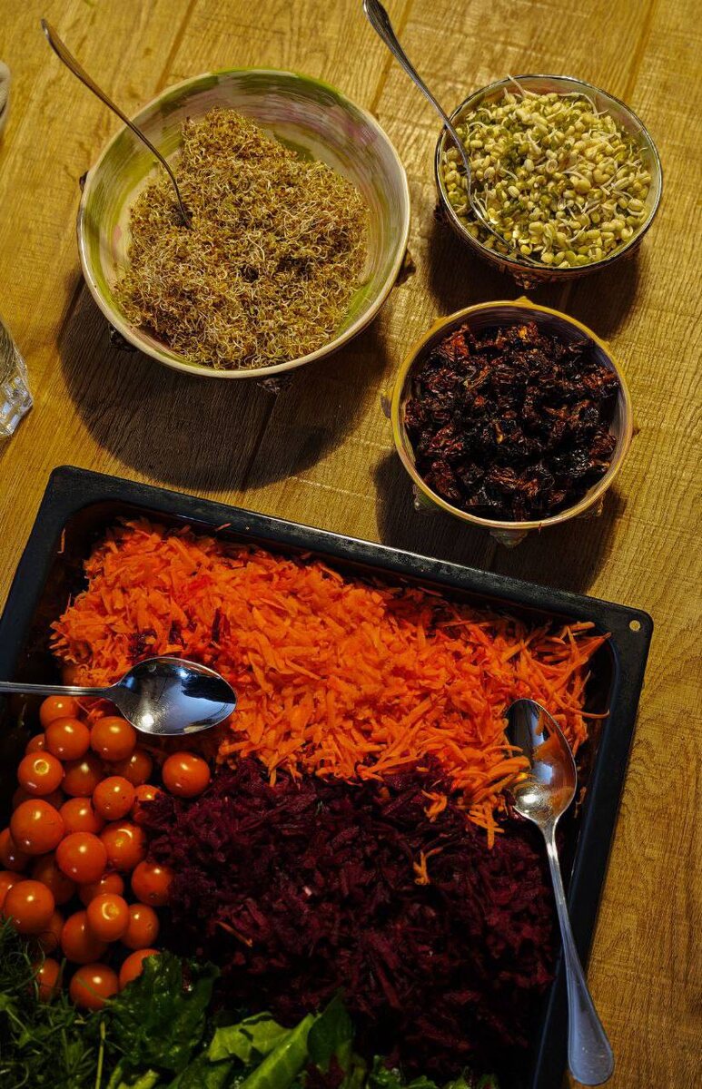 ! 😍🤩😎 🌿 Море живых, целительный и питательных продуктов, которые вдобавок к этому вкусные и красивые — идеальное сочетание! Все сыты, довольны и "семимильными" шагами идут к здоровью, энергии, красоте)) На визуале свекла, морковь, томаты свежие и вяленые, пророщенный маш и люцерна, зелень и микрозелень, льняные хлебцы (ассорти), амарантовая каша на овсяном молоке с корицей и бананом, соусы (чесночный, клюквенный, "зеленый"), напитки (комбуча, сурица, киноа-квас, вода)
