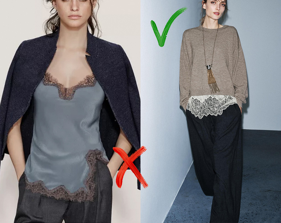 Лет десять назад были безумно популярны кружевные топы, например, в духе Falconeri. Многие их покупали, а потом забросили. То же самое с кружевными колготками — у меня, кстати, до сих пор лежат три пары кружевных колготок, купленных 12 лет назад, которые я и тогда так и не носила, не понимая, с чем их сочетать.