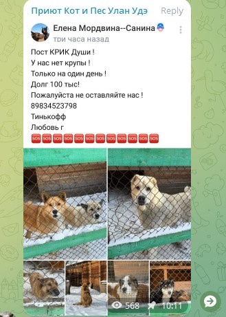 Здравствуйте, дорогие друзья! У нас полным ходом идет сбор на крупу. Завтра доварим остатки и если не выплатим долг хотя бы за 2 тонны, то новой партии нам не видать. Бьем во все колокола! Вот такой пост сегодня Лена разместила у себя в ВК. Без крупы, мяса и рабочих рук не будет приюта. Это наши первоочередные нужды. А есть еще мелкие, второстепенные, но не менее важные. Кашу мы варим на огне. Для этого закупаем дрова, а дрова нужно пилить и рубить. Затупилась цепь на нашей пиле и пришлось купить новую, так как точили мы ее уже бессчетное количество раз. Девочку нашли на улице Чайковского с открытым переломом. Оказалось, что девочка сбежала во время прогулки и ее искали. Тот редкий случай, когда искали, нашли, забрали. И еще поблагодарили и расходы компенсировали! Чайка-Туся, не убегай больше от мамы с папой! Пожелаем малышу долгой счастливой жизни в любви и заботе! Все в ужаснейшем состоянии. Их всех придется не только откармливать, но и лечить. Смотрите сами. Принимаем от Вас посылки