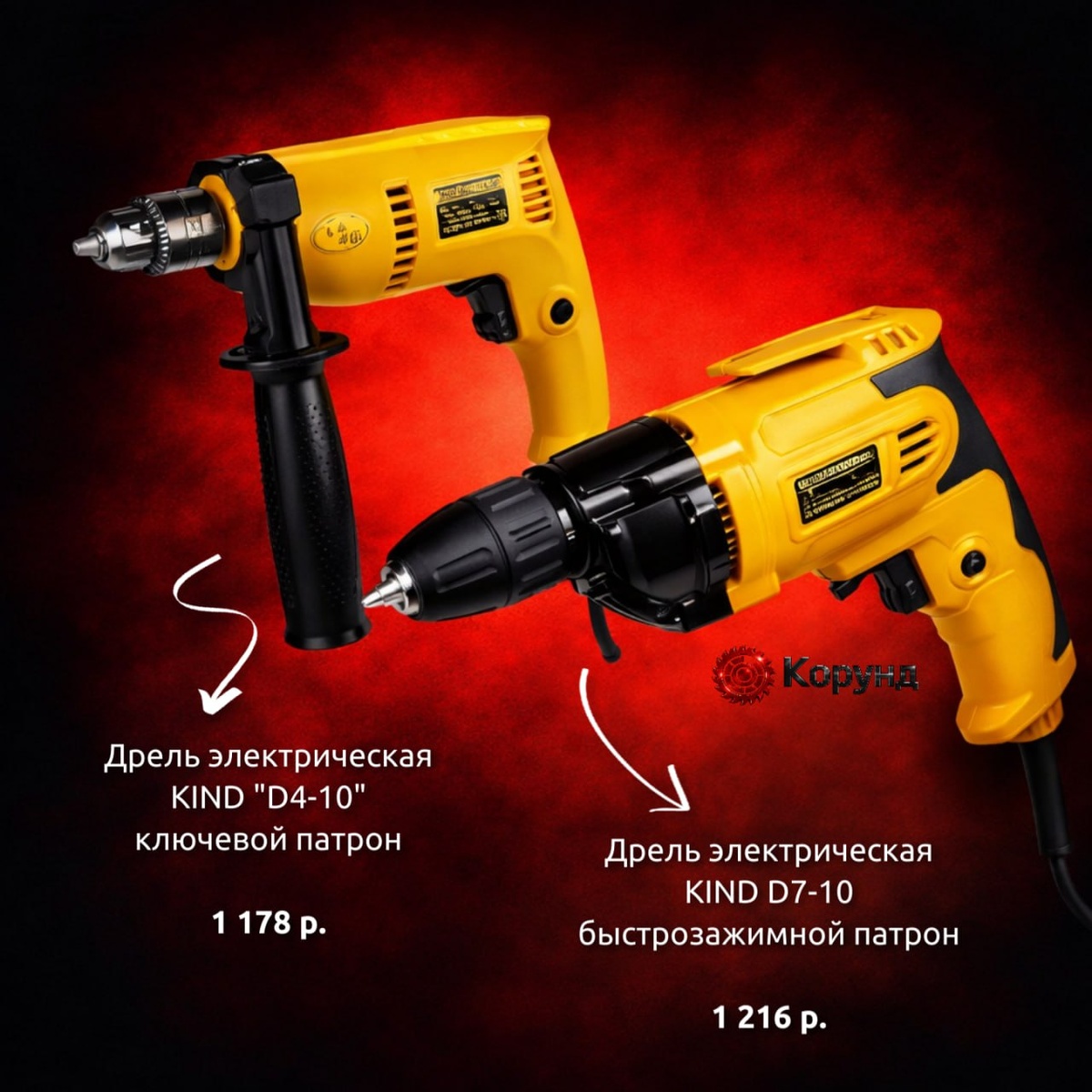 руб. Даже дрель можно купить по "праздничным ценам"! Так что присмотритесь⤵ 🔴Дрель электрическая KIND D7-10 быстрозажимной патрон, 2800 об/мин 🔴Дрель электрическая KIND "D4-10", ключевой патрон, 850Вт, 3000 об/мин 🔴Набор накидных ключей КГН 6-32, Eastman, 10 предметов 🔴Набор буров SDS-PLUS ф 5-12 мм (7 шт) 🔴Отвертка PH1x80мм Matador Все ссылки для заказа активны, господа!⬆ КОРУНД | инструмент и оснастка