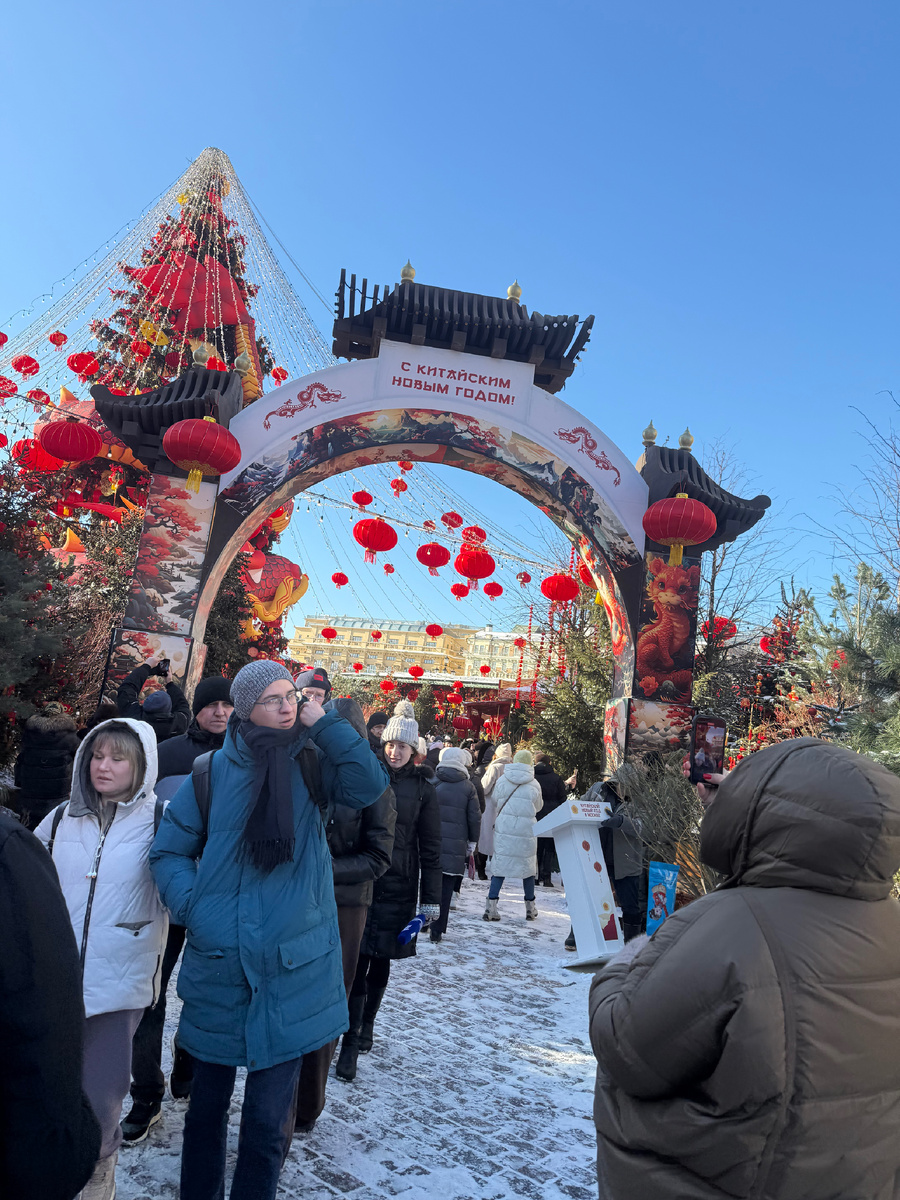 Площадка была открыта, но со входом снова возникли сложности: там была толпа. В центре возвышается огромная ёлка, вокруг которой обвит змей. Месяц назад её украшали шарики да флажки. Теперь им на смену пришли китайские фонарики.