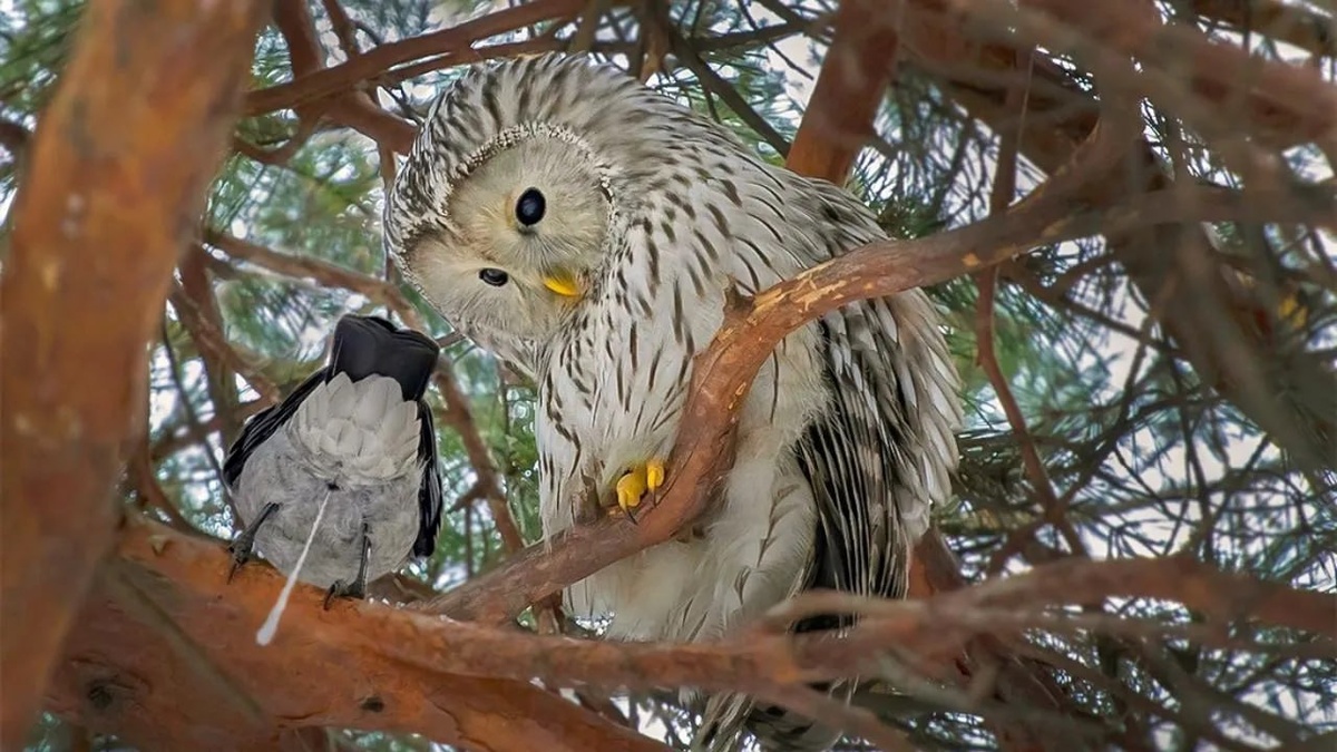 Фотограф Наталья Сытина запечатлела редкие кадры общения совы и вороны в национальном парке «Лосиный остров