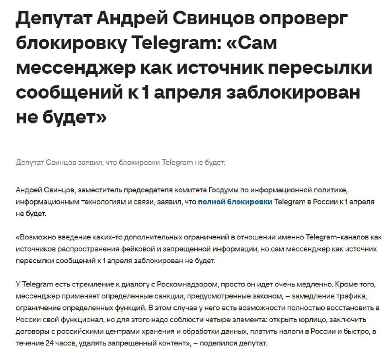 » Зампред комитета Госдумы по информполитике Андрей Свинцов заявил, что слухи о полной блокировке Telegram — это хайп. Ранее он же говорил, что WhatsApp* и YouTube блокировать не планируется. Но есть нюанс Формально «полной блокировки» нет. Фактически многие пользователи уже давно замечают: • нестабильную работу без дополнительных средств доступа, • замедления, • периодические проблемы с загрузкой медиа. И вот здесь начинается семантика. Если сервис технически доступен, но работает нестабильно — это блокировка или «особенности маршрутизации трафика»? Для бизнеса разницы немного: если канал связи не гарантирован, его надёжность падает. В чём реальный риск Самый опасный сценарий — не резкое отключение, а постепенная деградация: • сервис работает «через раз» • аудитория расслаивается • бизнес вынужден дублировать инфраструктуру • доверие падает Официальных решений о полной блокировке нет. Но и полной стабильности тоже нет. В сухом остатке: Пока это борьба интерпретаций. Юридич