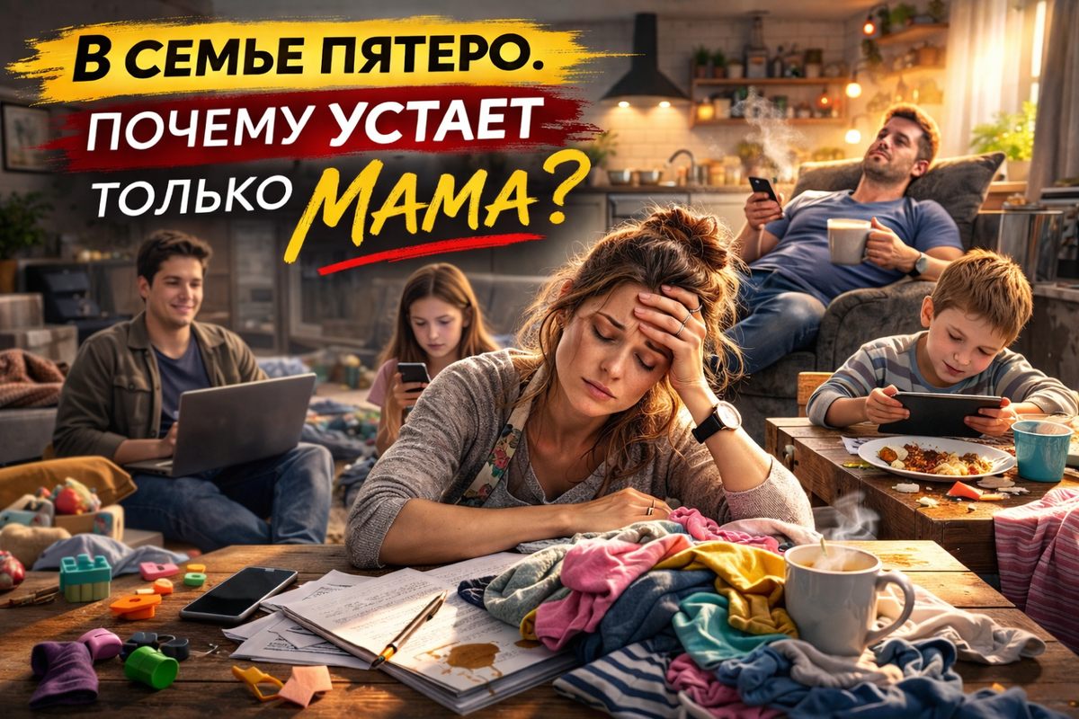 Недавно под одним постом разгорелась дискуссия. Мама троих детей — 19, 15 и 10 лет — написала, что очень устает. Не потому что дети маленькие. А потому что никто не помогает. Ни муж, ни дети. Она возит, готовит, стирает, контролирует уроки, держит в голове расписания и кружки. И говорит: «Я вымотана». И тут в комментариях началось. Одна женщина написала: «У меня тоже трое. Я ещё и работала с 8 до 5. И ничего, не ныла. Сейчас большинство так живёт». Другая ответила: «Когда помощи нет вообще — это не просто быт, это одиночество в семье». Третья добавила: «Проблема не в количестве дел. Проблема, когда ты одна за всё отвечаешь». Комментарии получились показательные. Половина — про «все так живут». Вторая половина — про то, что жить так тяжело. Когда в доме один взрослый Формально в семье пятеро. Фактически — один взрослый. Старшему 19 — он учится в другом городе. Сыну 10 — ещё ребёнок. Но дочери 15 лет. И это уже тот возраст, когда вполне можно помогать по дому: помыть посуду, разобра