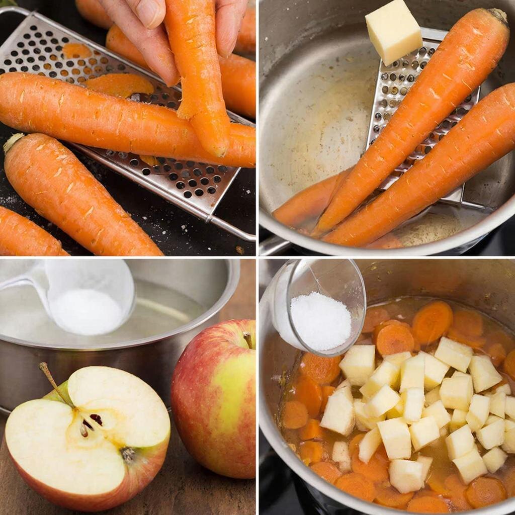 Тушите морковь на среднем огне под крышкой, периодически помешивая, до мягкости. Морковь должна стать нежной, но не разваливаться в пюре. - Приправление моркови:Когда морковь станет мягкой, добавьте сахар и щепотку соли. Соль здесь играет роль усилителя вкуса, подчеркивая сладость моркови и яблок.