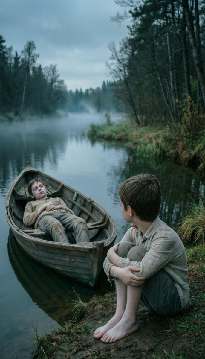 Меня (точнее, мое тело) подобрали какие-то люди на лодке и доставили к берегу. Во сне я была мальчиком лет десяти. Там я увидел своих родителей (нечетко) и стал возмущаться, почему они не принесли мне штаны. Я сидел, обхватив колени руками, словно замерзая, но родители с ужасом смотрели куда-то в сторону. Я проследил за их взглядом и увидел в лодке своё тело.