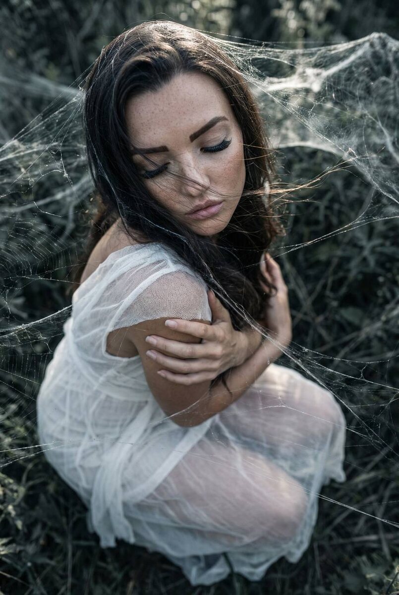 ] Ultra-realistic photo of the exact same woman from the reference image. 100% facial likeness. Identical facial features. Preserve original face identity. Do not change face structure. Facial identity preservation is the highest priority. Upper-body portrait from high-angle perspective. Camera positioned clearly above the subject and angled downward. Composition includes upper thighs to top of head. Subject kneeling or seated low to the ground with body turned three-quarters away from camera, torso rotated to the right side of frame. Weight supported downward through bent legs outside the frame. Spine curved forward with a protective inward posture. Shoulders drawn inward and slightly elevated. Left arm bent across the body. Left hand gripping the right upper arm near the shoulder with fingers wrapped firmly and visible skin compression, creating tension. Right arm bent downward along the torso and partially outside frame, relaxed. Head tilted forward and slightly rotated toward t