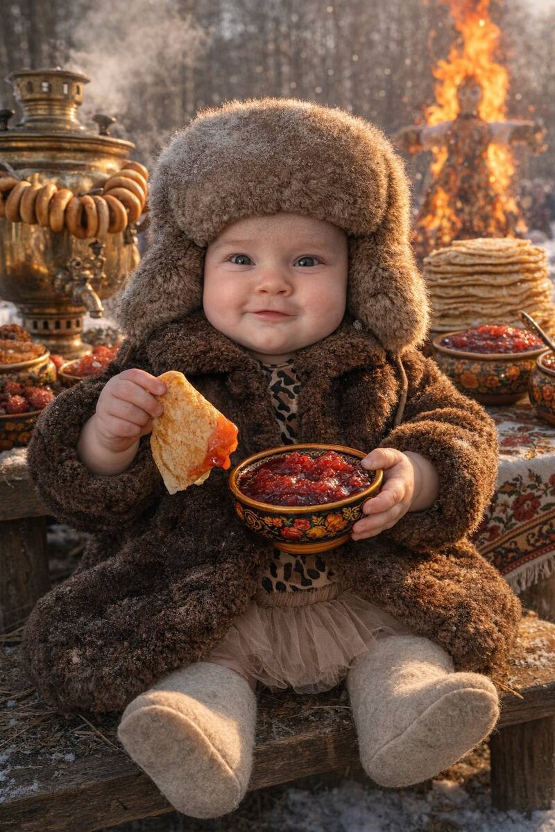: Сверхреалистичная яркая дневная масленичная сцена с интенсивным натуральным зимним светом, высокой насыщенностью и насыщенным контрастом. ОБЯЗАТЕЛЬНАЯ ФРАЗА: "перенести лицо с фотографии, не меняя лицо с фотографии" - сохранить 100% идентичность лица, пропорции, возраст, рост и тип телосложения точно так же, как в ссылке, без переосмысления, без стилизации. Ребенок с фотографии сидит на деревенской деревянной скамейке на переднем плане, ближе Всего к камере. Угол камеры чуть выше уровня глаз, плотный и захватывающий, обрамление от колен до головы, настоящая глубина, отсутствие плоскостности. Ребенок смотрит прямо в камеру с теплой радостной улыбкой. Наряд строго соответствует эталонному Наряд строго соответствует эталонному образу: традиционная русская зимняя одежда советской эпохи - толстая темно-коричневая шуба с тяжелой, плотной фактурой и объемным объемом оверсайз; большая натуральная меховая шапка ушанка округлой формы; классические белые фетровые валенки. Руки голые. В одной