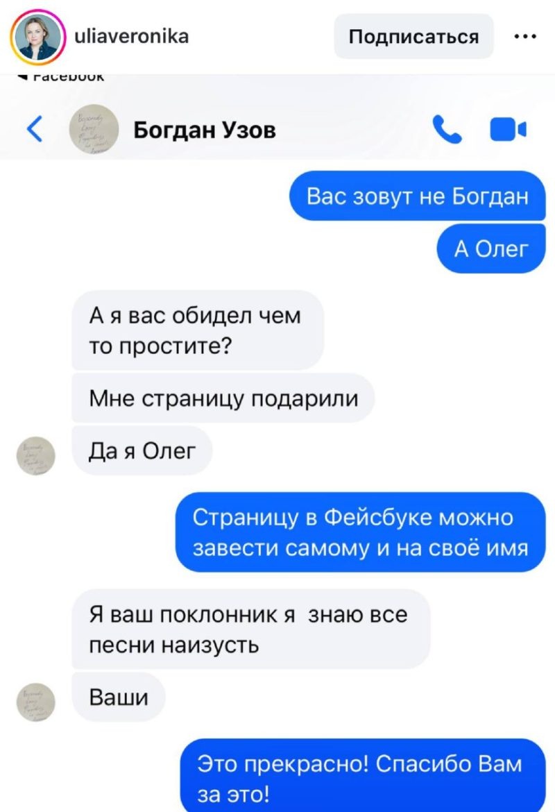 Все началось в 2021 году. Именно тогда Юлия начала получать хоть и странные, но на первый взгляд безобидные сообщения. Но дальше стало хуже. Неизвестный сталкер пытался добиться внимания Проскуряковой через ее знакомых и время от времени снова писал ей под разными именами и с разных страниц в социальных сетях. Все это время супруга Николаева молчала. Сейчас она решила предать огласке эту историю, чтобы всех предупредить о странном человеке. «Думала писать или нет этот пост, но всё-таки решила написать. C 2021 года меня преследует психически нездоровый человек... он звонит и пишет всем моим знакомым и друзьям, представляется, то инвалидом, то поклонником, то сценаристом, то кем-нибудь ещё... Был Богданом Узовым, потом Олегом Воронковым, потом Анной Кузьминой, а сейчас он Вячеслав, сценарист. Это всё один и тот же человек. Я прошу всех, кому он пишет быть внимательными! Этот человек не сценарист, не поклонник и не инвалид. Он, очевидно, болен! Будьте бдительны!» — обратилась ко всем жена