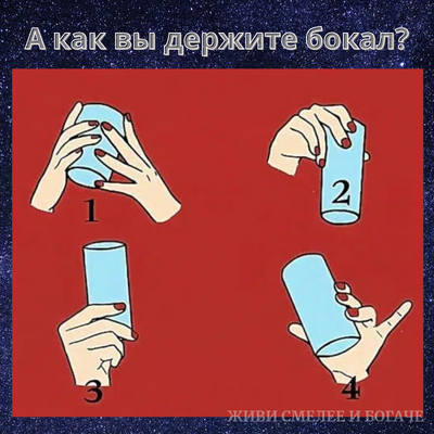 Держа стакан таким образом, вы можете выглядеть защищенно, словно держите все в себе. Люди, которых привлекает такое положение, на первый взгляд могут показаться сдержанными, хотя их эмоции скрыты глубоко внутри.