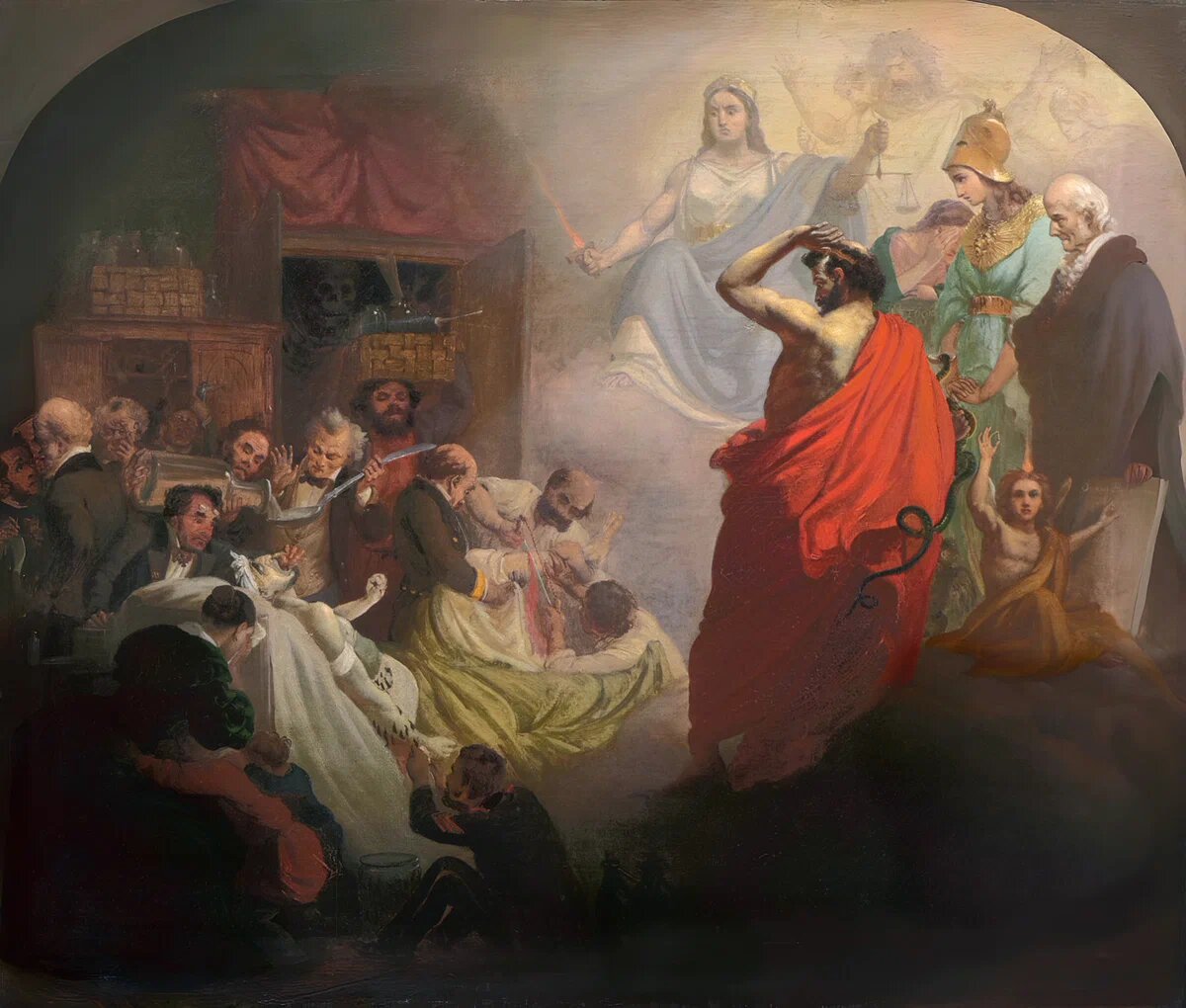 Перед ней, в красном плаще, — бог медицины Эскулап со своей неизменной змеёй. Он вскинул руку от гнева и возмущения. Рядом с ним богиня Афина — покровительница наук. У самого края полотна мы видим вполне реального исторического персонажа — немецкого врача Христиана Фридриха Самуэля Ганемана (1755–1843), основателя гомеопатии. Все положительные герои с неодобрением взирают на левую часть картины.