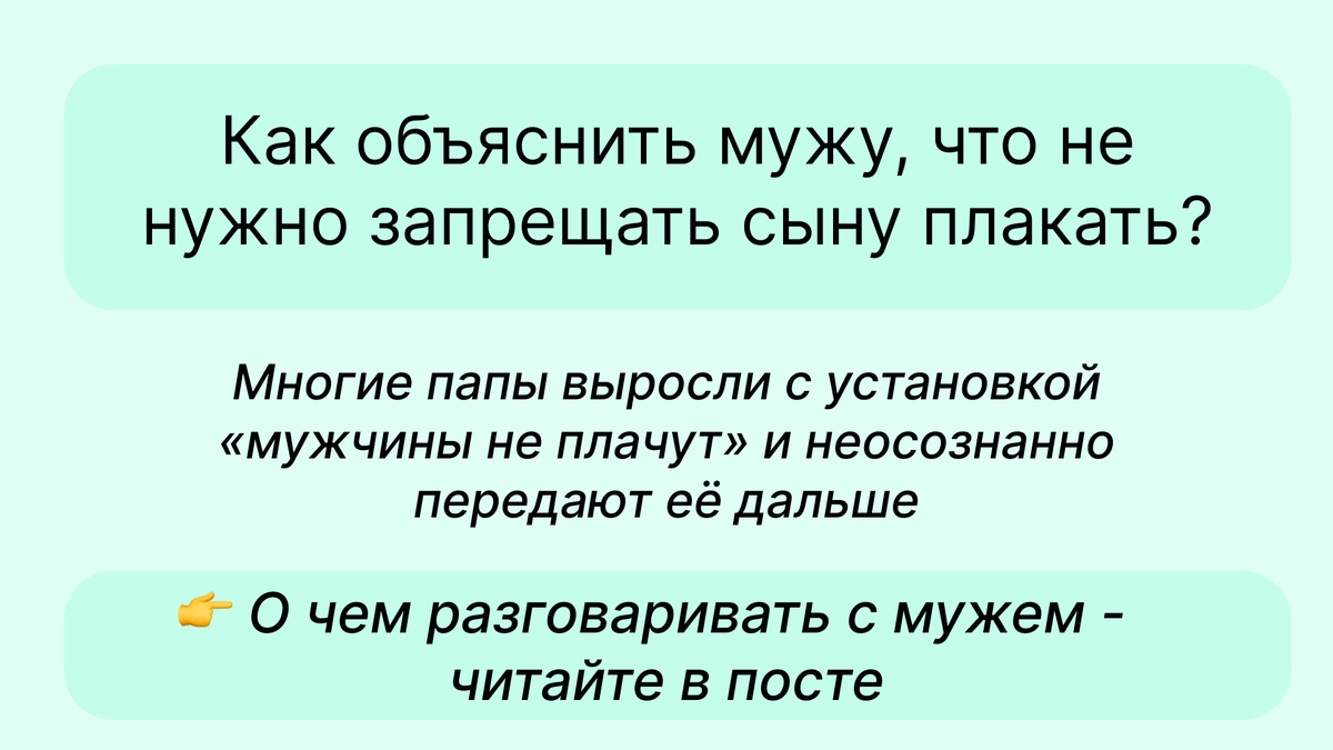 Муж действует на автомате - так воспитывали его самого, и в его картине мира такие фразы - это "закалка характера" и воспитание "настоящего мужчины". 👉Еще одна причина, по которой ему сложно выдерживать детские эмоции - это своя непрожитая внутренняя боль. Если она не осознается, то чужие эмоции могут очень сильно перегружать, и поэтому хочется неосознанно запрещать ребенку грустить и плакать. Поэтому важно постепенно давать мужу информацию о естественности разных чувств. 💡Ищите данные о том, какой вред мужчинам наносит подавление эмоций. Если мужу сложно соприкасаться с чувствами, и он относится к ним как к слабости, то факты (а не эмоциональные упреки) - это то, что нужно. Вот, например, что говорят исследования: 1 и 2 . ➡️Мужчины, которые придерживаются жестких убеждений о "мужественности" - не плакать, быть жестким - в два раза чаще испытывают депрессию и имеют суицидальные мысли. ➡️Сдерживание эмоций, вместо разумного управления ими (мы учим этому на группе “Точка опоры”), прив