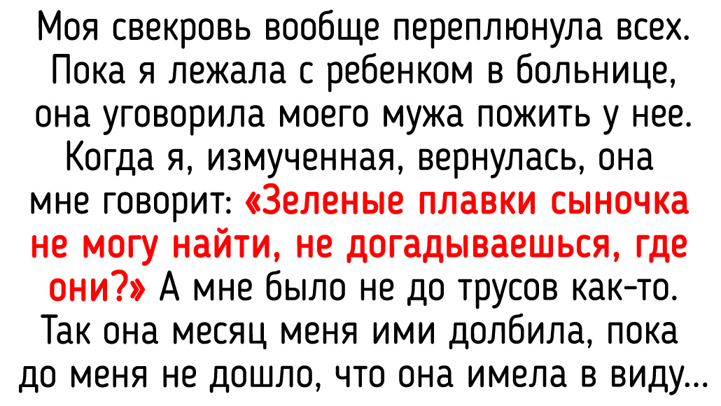 Моя свекровь вообще переплюнула всех. Пока я лежала с ребенком в больнице, она уговорила моего мужа пожить у нее. Когда я, измученная, вернулась, она мне говорит: «Зеленые плавки сыночка не могу найти, не догадываешься, где они?» А мне было не до трусов как-то. Так она месяц меня ими долбила, пока до меня не дошло, что она имела в виду. За 25 лет общения чего только не было с ее стороны, но теперь мы не общаемся. © olkaosoka