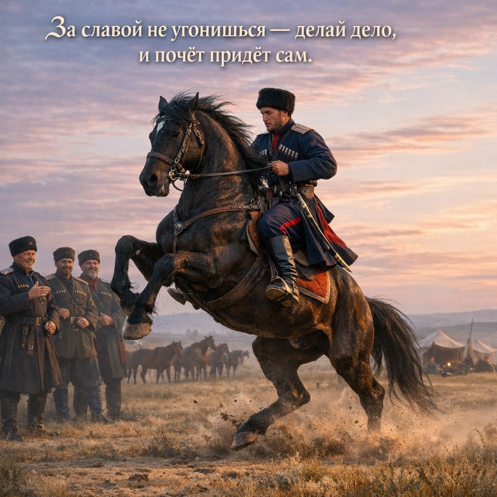 Эта поговорка родилась в среде, где ценили не громкие слова, а поступки. В казачьей жизни не принято было хвалиться или искать признания. Слава считалась следствием честной службы, мужества и верности долгу - но никогда самоцелью.