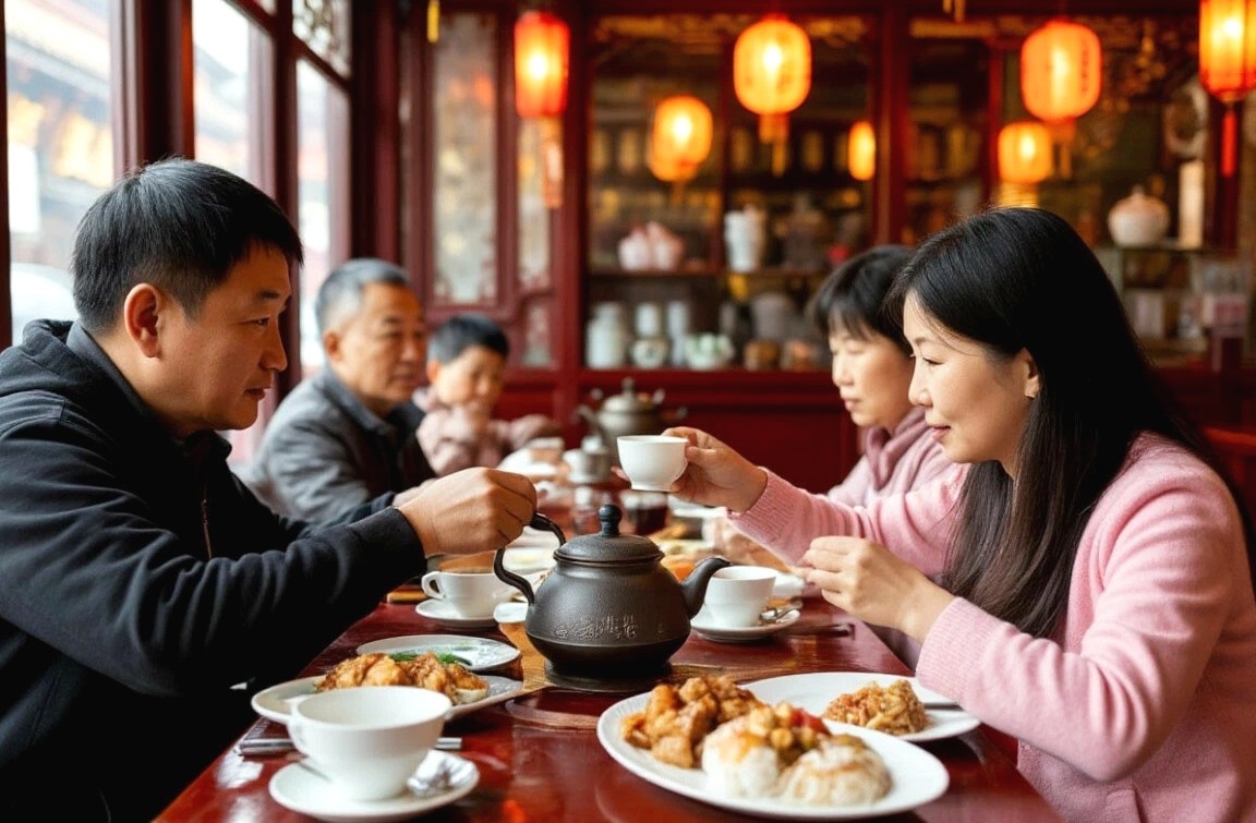 В России чай — завершение трапезы. В Китае чай пьют до еды или во время. Контраст привычек питания легко заметен и может вызвать лёгкое удивление. Я впервые столкнулась с этой разницей во время командировки в Гуанчжоу. Сидим за столом с китайскими коллегами, на столе уже стоят какие-то салаты, овощи, приборы расставлены. И тут официант ставит передо мной маленький чайничек с зелёным чаем. Я подумала: ну, наверное, приветственный напиток, пока блюда готовят. Но блюда уже были готовы. И все вокруг спокойно пили чай, параллельно накладывая себе рис и курицу в остром соусе. Я растерялась. В моей голове чай всегда шёл после супа, после второго, после всего. Это было что-то вроде точки в конце предложения. А тут — запятая в самом начале. Потом я поняла: в Китае чай — это не десерт. Это вообще не про сладкое и не про финал. Это просто часть еды. Его пьют до того, как начать есть, чтобы подготовить желудок. Его пьют во время, чтобы запивать жирное или острое. А после — совсем не обязательно. У